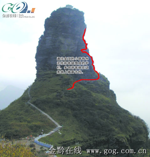 據劉先生介紹,當天在下雨,上午他們一行8人坐索道到了山上后,就分成了兩組。劉先生等6人從剛修通不久的木棧道去蘑菇石景區游覽,而同行的賴先生則與另一伙伴去攀登金頂。